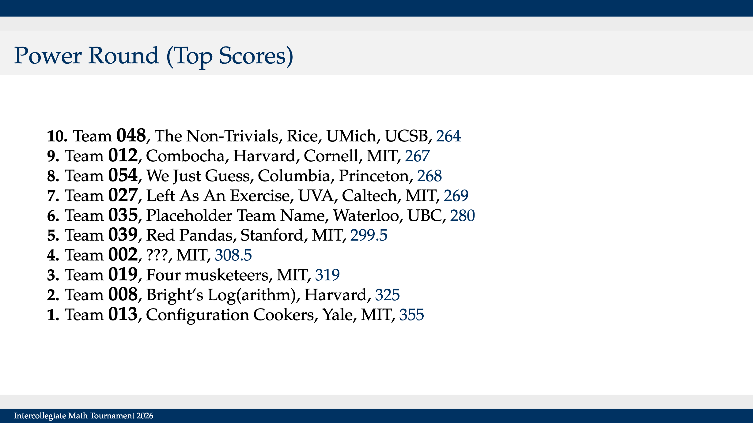 Despite the poor individual round we ended up in the top 10 teams overall. We prided ourselves in being the best team with no member from Harvard or MIT.