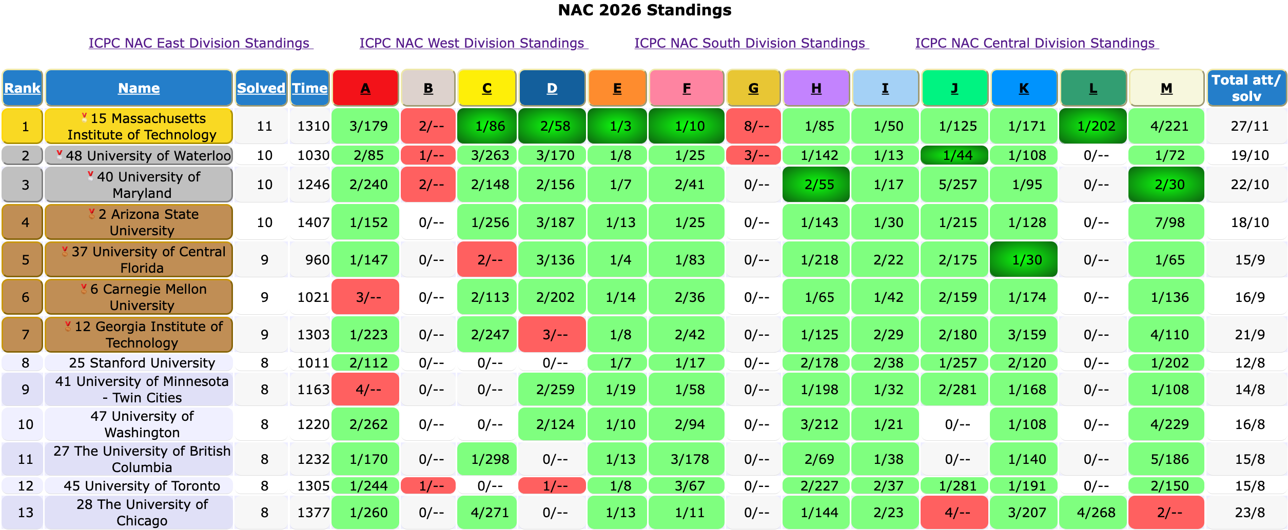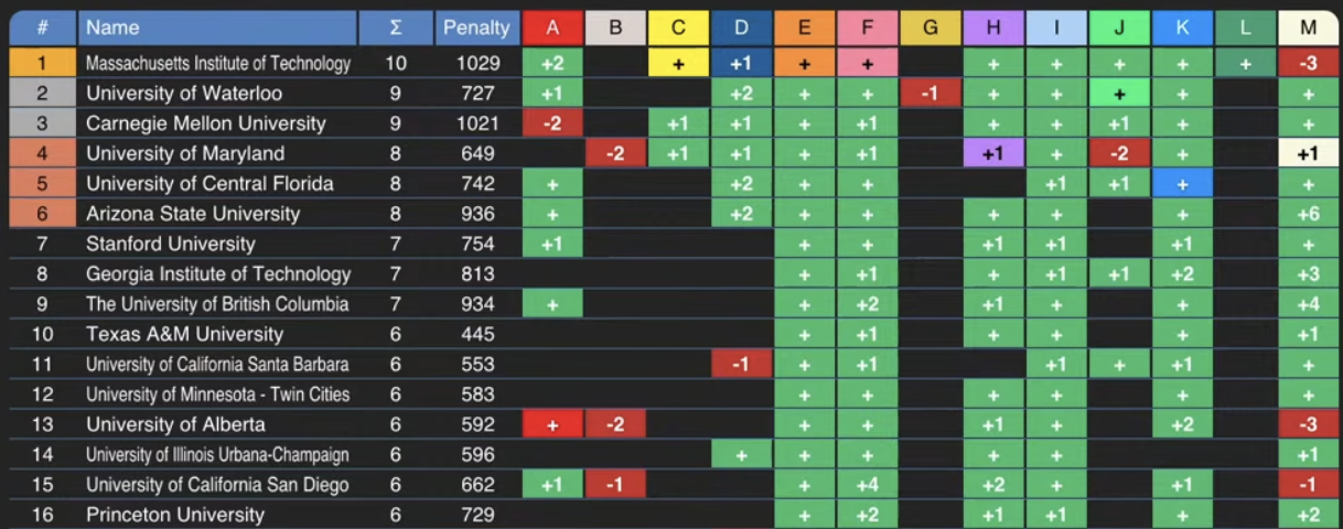 Later, Alex also got stuck on M’s implementation. Thankfully, at least Rain had no issues. For teams around the World Finals cutoff, the bottleneck was solving A, a medium-hard problem, and then solving at least one of the hard problems C, D, J. Almost no one solved B, G, L.
