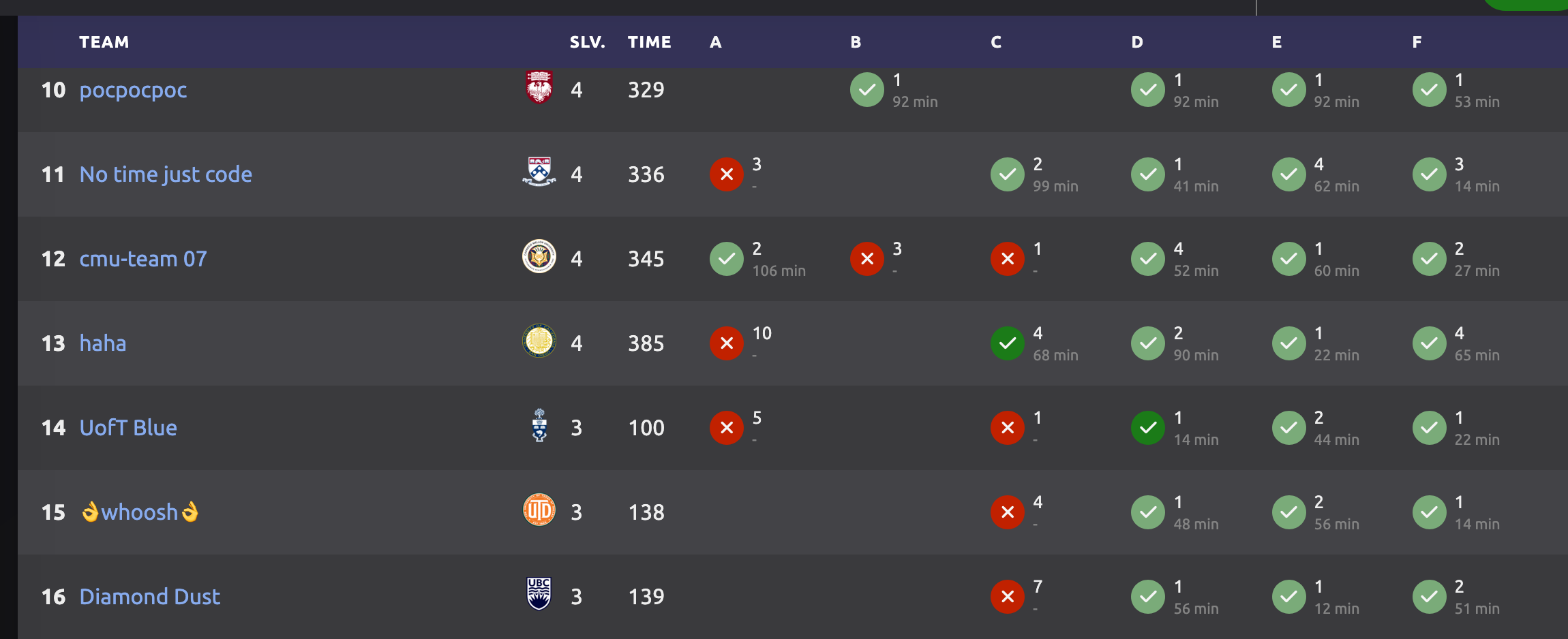 Thankfully I regained composure by solving A, and then quickly fixing F. Then, Alex managed to quickly fix M. In the span of 15 minutes we went from a very poor placement to 9th before the scoreboard freeze.